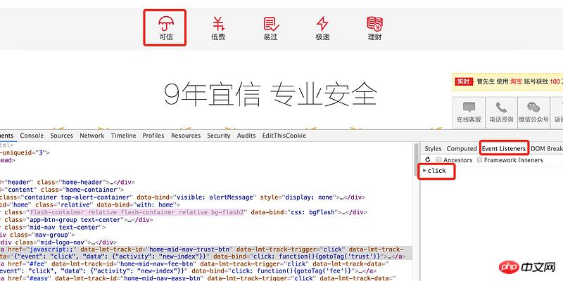 chrome开发者工具去看的元素上的事件列表,但是如果用的是jQuery等库去绑定事件的话是很难定位到事件的函数的。如果使用来定位通过