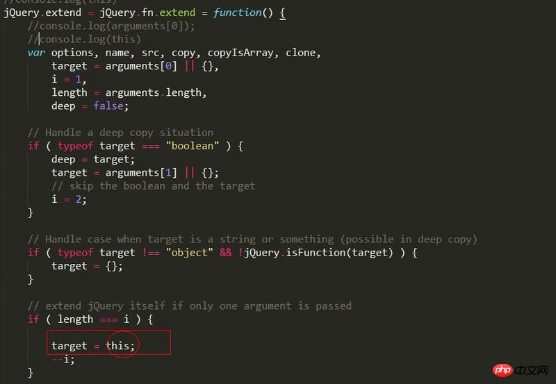 jQuery.extend 调用的时候,this是指向jQuery对象的,所以这里扩展在jQuery上。