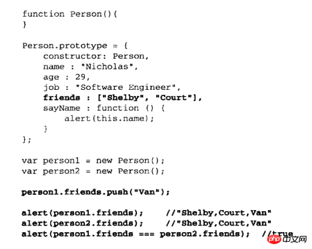 function Person() { } Person.prototype = { constructor: Person, name: 'Nicholas', age: '29', job: 'Software Engineer', friends: ['Shelby', 'Counrt'], sayName: function() { alert(this.name); } }; var person1 = new Person(['Van']); var person2 = new Person(); person1.friends = "Van"; console.log(person1);// Person {friends: 'Van'} console.log(person2);// Person {}