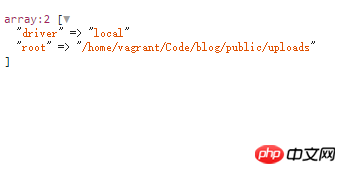 $this->app['config']["filesystems.disks.{$name}"]);返回数组。