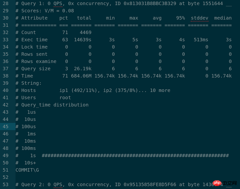 Count, sql的执行次数及占总的slow log数量的百分比. Time, 执行时间, 包括总时间, 平均时间, 最小, 最大时间, 时间占到总慢sql时间的百分比. 95% of Time, 去除最快和最慢的sql, 覆盖率占95%的sql的执行时间. Lock Time, 等待锁的时间. 95% of Lock , 95%的慢sql等待锁时间. Rows sent, 结果行统计数量, 包括平均, 最小, 最大数量. Rows examined, 扫描的行数量. Database, 属于哪个数据库 Users, 哪个用户,IP, 占到所有用户执行的sql百分比 Query abstract, 抽象后的sql语句 Query sample, sql语句 更多MySQL慢日志资料可以看看这个http://blog.csdn.net/yongcto/article/details/12065453