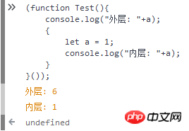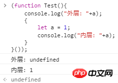 在外层使用输出语句能够正常打印出内层作用域的变量,当再次声明时则提示错误