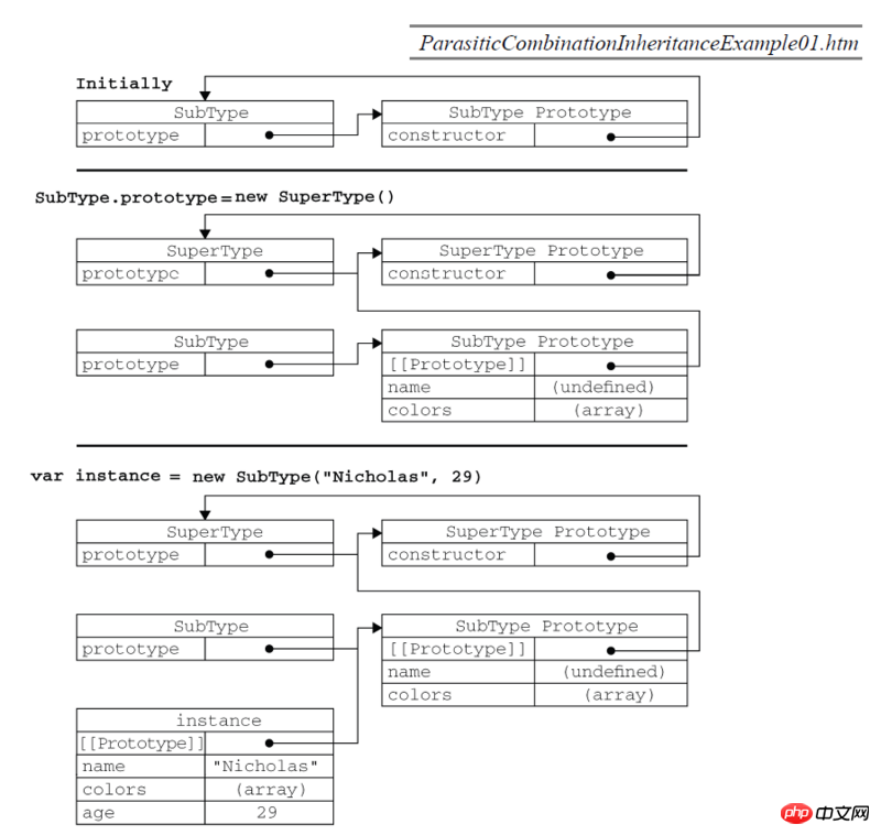 inheritPrototype(SubType,SuperType);这一行代码使得SubType.prototype的[prototype]指向了SuperType.prototype,但SubType.prototype本身不是 SuperType的实例,不具备name,colors等属性。