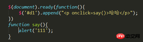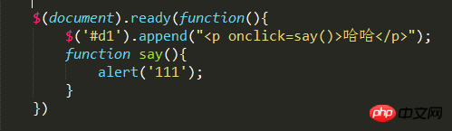 $(function() { var say = function() { alert(111); }; $p = $('<p>哈哈</p>'); $p.on('click', say); $('#d1').append($p); });