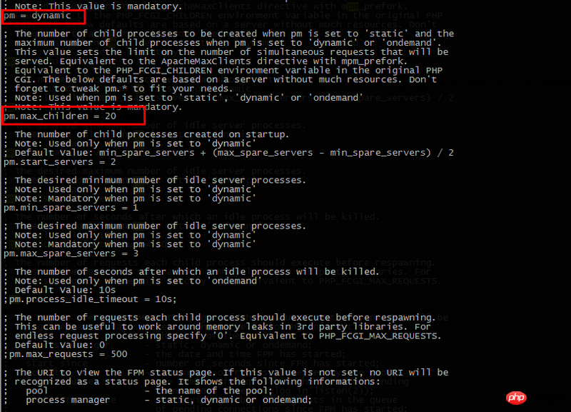 2.服务器使用的是阿里云,nginx+php-fpm,一直怀疑是php-fpm开启的进程数不够,但是已经将最大的允许进程数设置到20,(php-fpm.conf的配置)如下图: