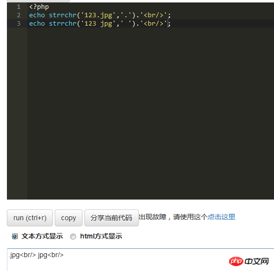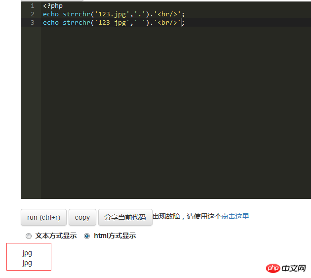 echo strrchr('123.jpg','.').'<br/>'; echo strrchr('123 jpg',' ').'<br/>';