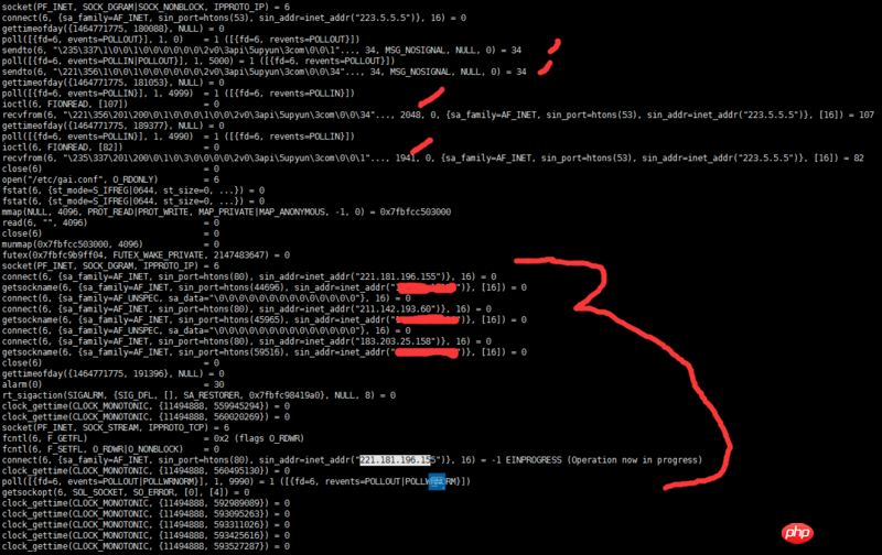 connect(6, {sa_family=AF_INET, sin_port=htons(80), sin_addr=inet_addr("221.181.196.155")}, 16) = 0