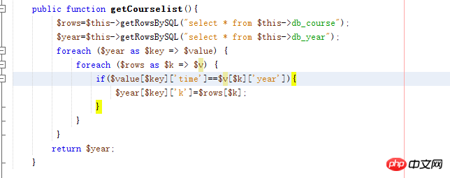 public function getCourseList() { $rows = $this->getRowsBySQL('select * from '.$this->db_course); $year = $this->getRowsBySQL('select * from '.$this->db_year); foreach($year as &$item) { foreach($rows as $row) { if($item['time'] == $row['year']) { $item['k'][] = $row; } } } return $year; }