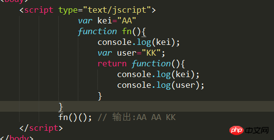 var kei = "AA"; function fn() { var kei = "haha"; //此处更改了一下 console.log(kei); var user = "KK"; return function(){ console.log(kei); console.log(user); } } fn()(); // 输出haha haha KK
