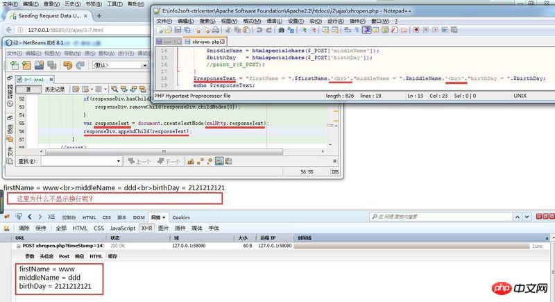 为什么页面上显示的不是换行,但下面XHR中的HTML显示换行呢?初学ajax和php,简单疑问请大神赐教哈