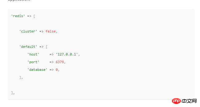 'redis' => [ 'cluster' => false, 'default' => [ 'host' => '127.0.0.1', 'port' => 6379, 'database' => 0, ], ],