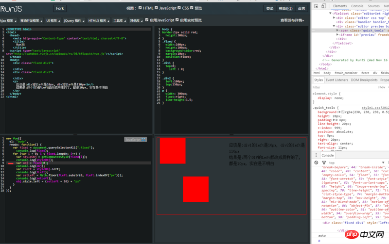 用vue的实现就有问题了, 在ready方法里面的代码和上面是一样的, 可是两个p的left值都设置成10px, 跟代码执行错误一样, 详见:http://runjs.cn/detail/idrn5np8