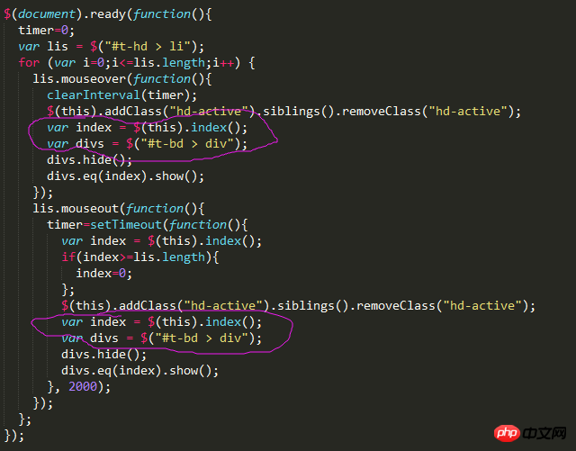 然后画圈的两个,为什么只能写在mouseover 跟 mouseout里面?写在外面会没有效果?