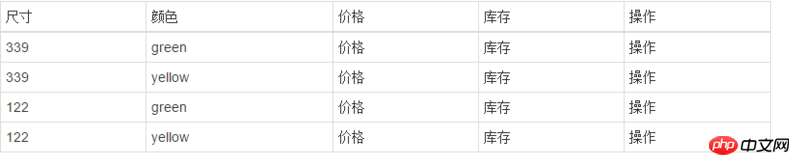 html += '<tr><td>' + e + '</td><td>' + r + '</td><td>价格</td><td>库存</td><td>操作</td></tr>';