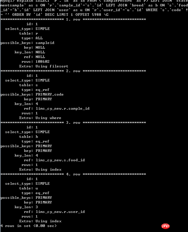 SELECT `r`.`id` as id FROM (`samplerecord` as r) LEFT JOIN `statementsample` as s ON `r`.`sample_id`=`s`.`id` LEFT JOIN `breed` as b ON `s`.`food_id`=`b`.`id` LEFT JOIN `user` as u ON `r`.`user_id`=`u`.`id` WHERE `s`.`code` != '' ORDER BY `id` DESC LIMIT 1 OFFSET 5988