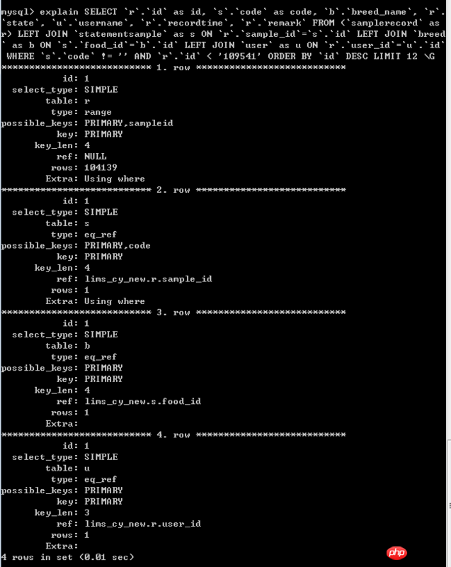 SELECT `r`.`id` FROM (`samplerecord` as r) LEFT JOIN `statementsample` as s ON `r`.`sample_id`=`s`.`id` LEFT JOIN `breed` as b ON `s`.`food_id`=`b`.`id` LEFT JOIN `user` as u ON `r`.`user_id`=`u`.`id` WHERE `s`.`code` != ''
