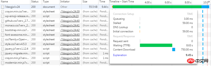 第一个请求是页面文件,可以看到等待服务器响应花了9秒钟。。。