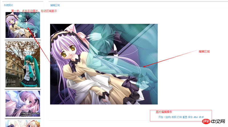 <head> <meta charset="UTF-8"> <title></title> <style> body{ overflow-x: hidden; overflow-y: auto; } .img_box{ display: inline-block; width: 150px; height: 100%; padding: 0; margin: 0; list-style: none; float: left; } .img_box li{ display: block; width: 100%; height: 150px; } .img_box li img{ width: 100%; height: 100%; } .edit_box{ display: inline-block; padding-left: 150px; width: 1000px; height: 800px; float: left; } .edit_box img{ width: 100%; height: 100%; } </style> </head> <body> <p > <ul class="img_box"> <li><img src="../img/cof.jpg"></li> <li><img src="../img/cof1.jpg"></li> <li><img src="../img/cof2.jpg"></li> <li><img src="../img/cof3.jpg"></li> <li><img src="../img/cof4.jpg"></li> </ul> <p class="edit_box"> </p> </p> <p class="edit_btn"> <input type="button" id="rod" value="旋转"> <input type="button" id="dama" value="打码"/> <input type="button" id="caij" value="裁剪"/> </p> <script> var list=document.getElementsByClassName("img_box")[0]; var list_item=list.children; var e_box=document.getElementsByClassName("edit_box")[0]; var num=0; var rod=document.getElementById("rod"); var dama=document.getElementById("dama"); var caij=document.getElementById("caij"); for (var i=0,len=list_item.length;i<len;i++) { (function(i){ list_item[i].onclick=function(){ var iurl=this.children[0].src; creatdom(iurl); } })(i) } function creatdom(iurl){ e_box.innerHTML="<img src="+iurl+">"; } rod.onclick=function(){//旋转的方法 num++; e_box.style.cssText='transform: rotate('+90*num+'deg);'; } dama.onclick=function(){//我不明白你的打码是几个意思,我就做成了修改透明度了 num++; if(num<=10){ e_box.style.cssText="opacity: "+num*0.1+";"; }else{ e_box.style.cssText="opacity: 0.1;"; num=0; } } //caij的方法你可以去看看http://www.zhangxinxu.com/study/201005/image-crop-rotation-demo.html,懒得弄了 </script> </body>