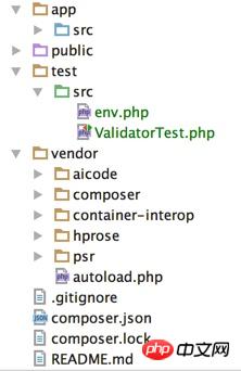 其中test下的src目录是测试用例的源码目录,test/src/env.php文件就是项目册初始化脚本,因为项目中使用了 Composer 进行项目管理,并采用了psr-4规范的命名空间,因此该文件的内容非常简单。