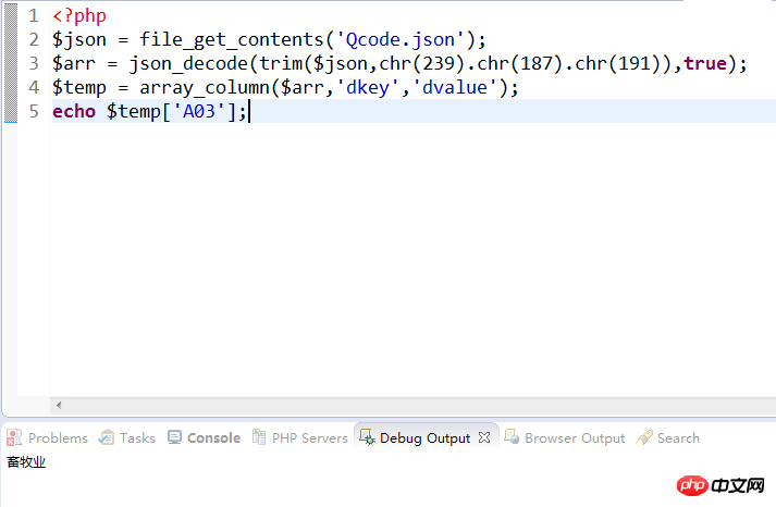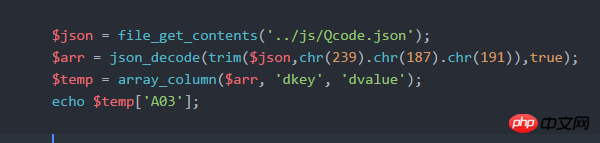 $json = file_get_contents('Qcode.json'); $arr = json_decode(trim($json, chr(239) . chr(187) . chr(191)), true); $temp = array_column($arr, 'dkey', 'dvalue'); echo $temp['A05']; if (! function_exists('array_column')) { function array_column(array $input, $columnKey, $indexKey = null) { $array = array(); foreach ($input as $value) { if (! isset($value[$columnKey])) { trigger_error("Key \"$columnKey\" does not exist in array"); return false; } if (is_null($indexKey)) { $array[] = $value[$columnKey]; } else { if (! isset($value[$indexKey])) { trigger_error("Key \"$indexKey\" does not exist in array"); return false; } if (! is_scalar($value[$indexKey])) { trigger_error("Key \"$indexKey\" does not contain scalar value"); return false; } $array[$value[$indexKey]] = $value[$columnKey]; } } return $array; } }