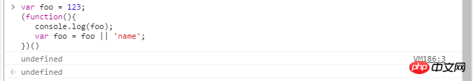 var foo=123; (function(){ var foo;//var声明被提前了 console.log(foo);//所以这里不会访问到外部的123,而是因为访问内部的foo,但还没到赋值阶段,所以undefined foo = foo || 'name'; })()
