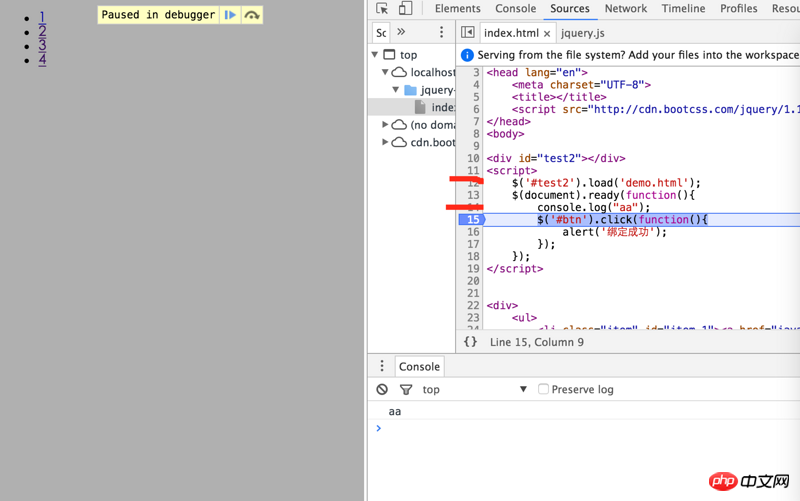 尤其是第三步可以明显看到,index.html是最先加载的,因此此时的DOMContentLoaded事件已经触发,所以jquery封装的ready事件也触发了,由于$.load是异步执行的,所以浏览器解析的时候,$.load放在之后执行,通过断点也可以看出,ready下的console最先打印出数据,之后才是$.load加载的html。