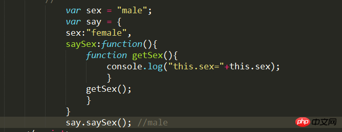 var obj = { ... saySex:function(){ console.log(this) //此处this指向obj,因为你能够调用saySex,必然是obj.saySex()通过obj调用; //getSex()在saySex函数内部定义的函数,作用域在函数内部,所以对于是谁在调用saySex,getSex无法知道,除非你告诉它; var that = this; function getSex(){ console.log("this.sex=" + this.sex); console.log(that.sex); //此处可以取到你想要的值; } getSex(); //此处并没有明确的对象调用getSex,所以默认全局调用; }, ... }