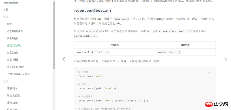 所谓编程式导航,就是通过显示的程序语句来切换当前“页面”,类似于原生 JS 中 window.location.href = xxx history.go(-1) 这样。而 vue-router 里有它自己的语法,比如 $router.push('xxx') 之类的,如果单纯的文档看不懂,可以找一个简单的相关开源项目边学边看。