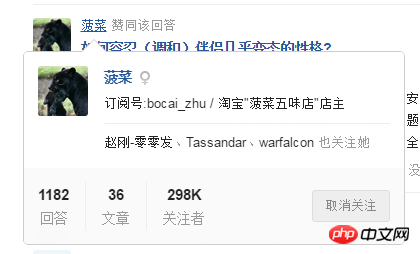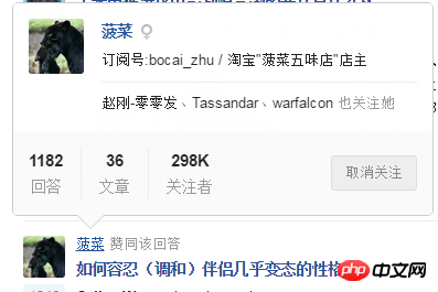 当鼠标hover在用户名上,会弹出一张名片,然后可以把鼠标继续移动到名片上进行一些操作:
