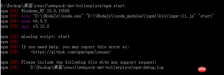 npm start 是运行 package.json 文件中的 script 中的 start, missing script 说明没有配置这命令。