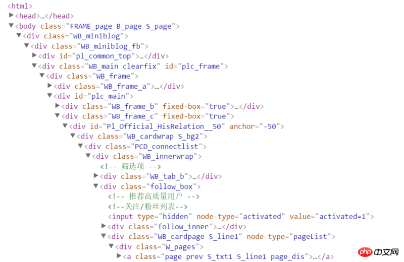 用python写小脚本想爬取新浪科技的粉丝http://weibo.com/1642634100/fans,先要获得粉丝页数,用chrome看到的html结构如下: