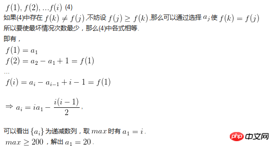 可以看出{a{i}} 为递减数列,取max时有a1=i.max>=200,解出a1=20 .所以扔的楼层分别为20,19,18,17,16,15,14,13,12,11,10,9,8,7,6,5次数为20.
