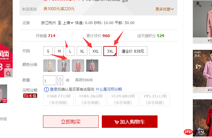 我的思路,服务器端将所有可能的结果,比如“中码,红色”、“大码,蓝色”全部返回到前端,前端将结果存在一个对象中。然后根据选择的属性做出相应的判断。