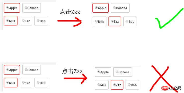 目前,我的代码可以用在单个 radio group. 如果是多个就出现问题。 点击第二排Zzz的时候,就连上面那排的红色边框也不见了。。。