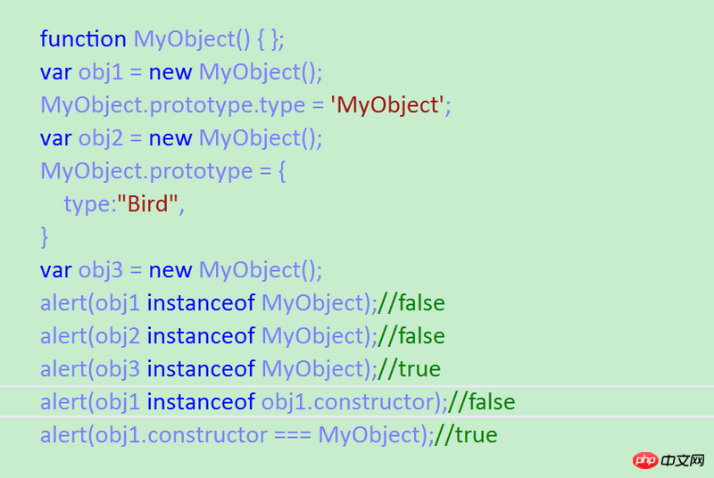 function MyObject(){}//[1] var obj1=new MyObject();//[2] console.log('[2]'+(obj1 instanceof MyObject));//true console.log(obj1.__proto__===MyObject.prototype);//true MyObject.prototype.type='MyObject';//[3] var obj2=new MyObject();//[4] console.log('[4]'+(obj2 instanceof MyObject));//true MyObject.prototype={//[5] type:"Bird" } var obj3=new MyObject();//[6] console.log('[6]'+(obj3 instanceof MyObject));//true console.log(obj1 instanceof MyObject);//[7] false console.log(obj2 instanceof MyObject);//[8] false console.log(obj3 instanceof MyObject);//[9] true console.log(obj1 instanceof obj1.constructor);//[10] false console.log(obj1.constructor ===MyObject);//[11] true