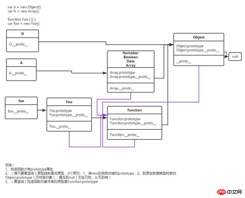 ①每个对象(包括函数、函数的prototype对象)都有一个__proto__属性,她指向创建该对象的函数的prototype属性