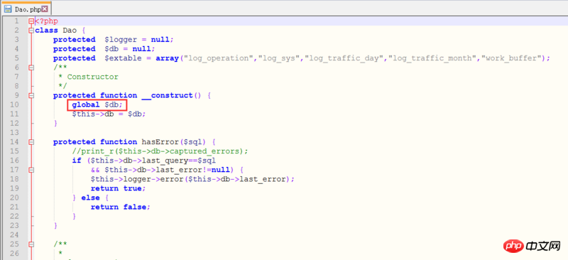 在Dao.php中直接可以global $db?我如何找到这个对象定义的地方呢,zendstudio给指到了第四行protected $db = null;这里,但是这里的对象是空呀,不明白,请大神赐教啊