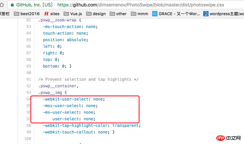 因为插件的样式文件photoswipe.css 中添加了 user-select: none; 你去掉应该就行了看下图: