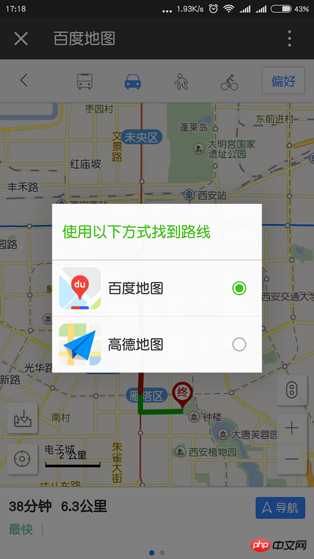 但是在打开的网页版百度地图中点击导航按钮,是可以弹出 使用哪个APP打开的 系统提示(如图所示)。