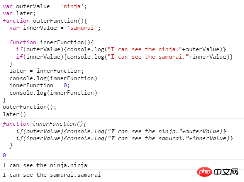 第一次给later=innerFunction时,later变量保存指向一个函数的引用。注意是保存函数引用而不是赋值。所以后来innderFunction变成0了,但是later还是指向之前引用的函数,与innderFunction是什么无关。比如: