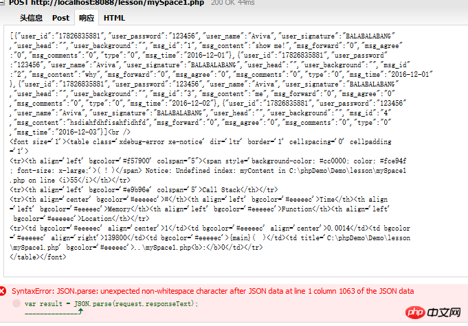 如果要返回HTML+JSON数据,可以把数据存储在php对象里面,然后返回到JS的数据。数据不可以混合输出。