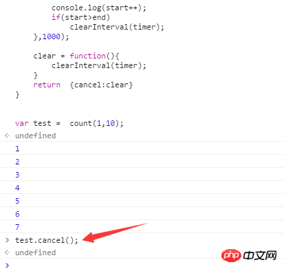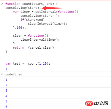 function count (start, end) { console.log(start++); var timer = setInterval(function () { if (start > end) { cancel(); } else { console.log(start++); } }, 100); function cancel () { if (timer) { clearInterval(timer); } } return {cancel: cancel}; }