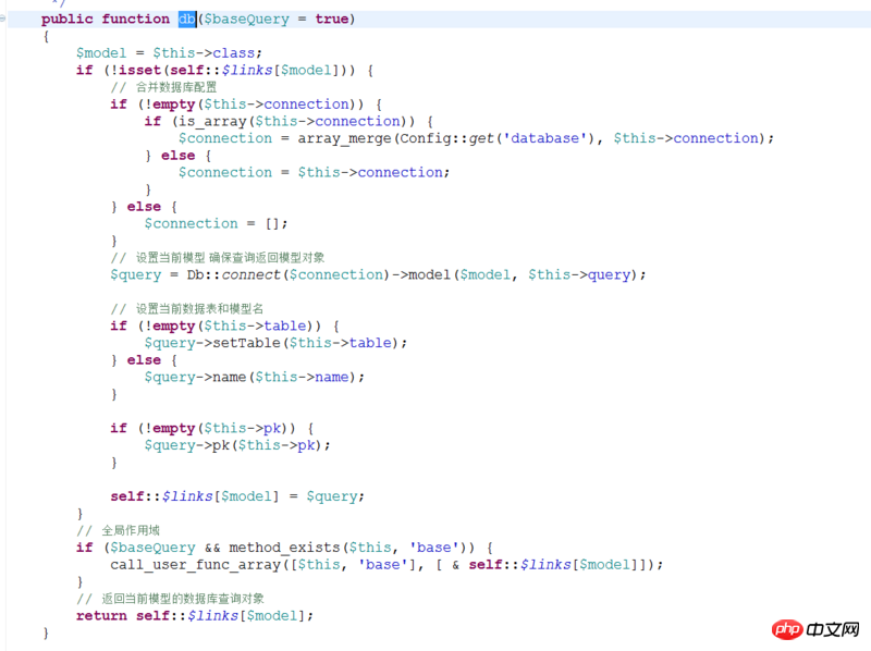__callStatic是一个魔术方法,在调用不存在的静态方法时,会将函数名和参数传入此方法调用。链式调用的原理则是中间方法会返回一个对象,return $this;,或这段代码里的数据库查询对象。