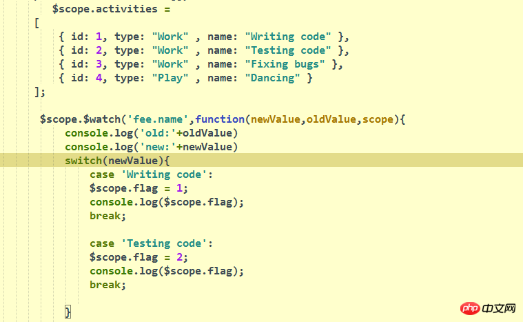 $scope.$watch('fee',function(newV,oldV){ .... });