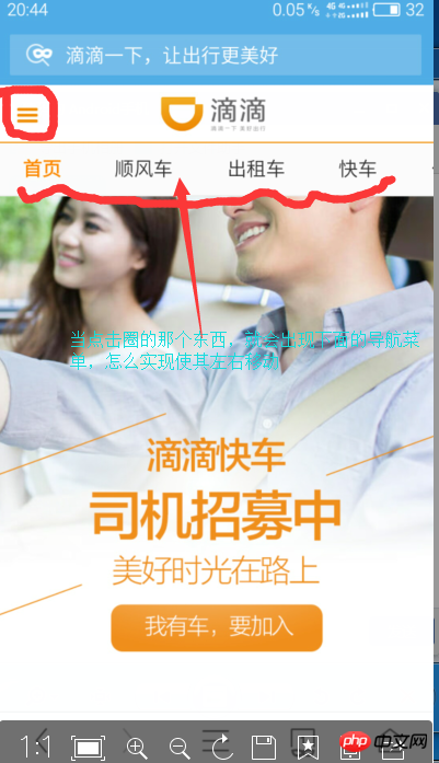 当点击圈的那个东西,就会出现下面的导航菜单,怎么实现使其左右移动