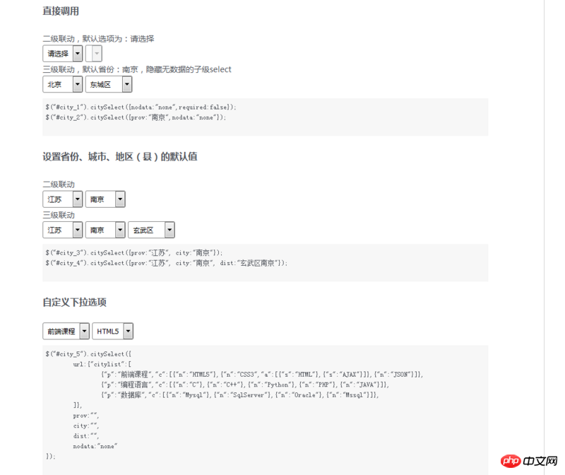 <!DOCTYPE html> <html> <head> <meta http-equiv="Content-Type" content="text/html; charset=utf-8" /> <title>jQuery省市区三级联动</title> <link rel="stylesheet" type="text/css" href="http://www.sucaihuo.com/jquery/css/common.css" /> <style type="text/css"> .demo{width:80%; margin:20px auto} .demo h3{height:32px; line-height:32px} .demo p{line-height:24px} pre{margin-top:10px; padding:6px; background:#f7f7f7} </style> </head> <body> <p class="container" id="main"> <h2 class="title"><a href="http://www.sucaihuo.com/js/34.html" target="_blank">jQuery省市区三级联动</a></h2> <p class="demo"> <h3>直接调用</h3> <p>二级联动,默认选项为:请选择</p> <p id="city_1"> <select class="prov"></select> <select class="city" disabled="disabled"></select> </p> <p>三级联动,默认省份:南京,隐藏无数据的子级select</p> <p id="city_2"> <select class="prov"></select> <select class="city" disabled="disabled"></select> <select class="dist" disabled="disabled"></select> </p> <pre> $("#city_1").citySelect({nodata:"none",required:false}); $("#city_2").citySelect({prov:"南京",nodata:"none"}); </pre> </p> <p class="demo"> <h3>设置省份、城市、地区(县)的默认值</h3> <p>二级联动</p> <p id="city_3"> <select class="prov"></select> <select class="city" disabled="disabled"></select> </p> <p>三级联动</p> <p id="city_4"> <select class="prov"></select> <select class="city" disabled="disabled"></select> <select class="dist" disabled="disabled"></select> </p> <pre> $("#city_3").citySelect({prov:"江苏", city:"南京"}); $("#city_4").citySelect({prov:"江苏", city:"南京", dist:"玄武区南京"}); </pre> </p> <p class="demo"> <h3>自定义下拉选项</h3> <p id="city_5"> <select class="prov"></select> <select class="city" disabled="disabled"></select> <select class="dist" disabled="disabled"></select> </p> <pre> $("#city_5").citySelect({ url:{"citylist":[ {"p":"前端课程","c":[{"n":"HTML5"},{"n":"CSS3","a":[{"s":"HTML"},{"s":"AJAX"}]},{"n":"JSON"}]}, {"p":"编程语言","c":[{"n":"C"},{"n":"C++"},{"n":"Python"},{"n":"PHP"},{"n":"JAVA"}]}, {"p":"数据库","c":[{"n":"Mysql"},{"n":"SqlServer"},{"n":"Oracle"},{"n":"Mssql"}]}, ]}, prov:"", city:"", dist:"", nodata:"none" }); </pre> </p> </p> <p class="foot"> Powered by sucaihuo.com 本站皆为作者原创,转载请注明原文链接:<a href="http://www.sucaihuo.com" target="_blank">www.sucaihuo.com</a> </p> <script type="text/javascript" src="http://www.sucaihuo.com/Public/js/other/jquery.js"></script> <script type="text/javascript" src="jquery.cityselect.js"></script> <script type="text/javascript"> $(function() { $("#city_1").citySelect({ nodata: "none", required: false }); $("#city_2").citySelect({ prov: "南京", nodata: "none" }); $("#city_3").citySelect({ prov: "江苏", city: "南京" }); $("#city_4").citySelect({ prov: "江苏", city: "南京", dist: "玄武区南京", nodata: "none" }); $("#city_5").citySelect({ url: {"citylist": [ {"p": "前端课程", "c": [{"n": "HTML5"}, {"n": "CSS3", "a": [{"s": "HTML"}, {"s": "AJAX"}]}, {"n": "JSON"}]}, {"p": "编程语言", "c": [{"n": "C"}, {"n": "C++"}, {"n": "Python"}, {"n": "PHP"}, {"n": "JAVA"}]}, {"p": "数据库", "c": [{"n": "Mysql"}, {"n": "SqlServer"}, {"n": "Oracle"}, {"n": "Mssql"}]}, ]}, prov: "", city: "", dist: "", nodata: "none" }); }); </script> </body> </html>