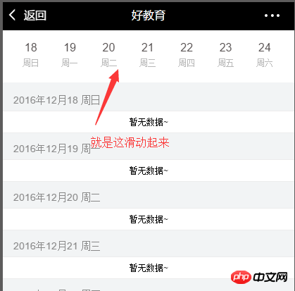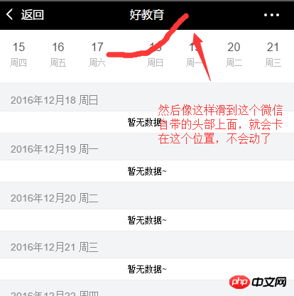 咳咳,还是这个滑动效果,这次呢,还是一个小问题。这个效果就是左右滑动切换一周,然后下方会刷新一周的数据,因为是做在微信里面,平时平滑是没有关系的,但是!!,如果咱滑动的时候往上面移动,对,就是往上移动到那个微信自带的头部上时,就会卡在那!!!。