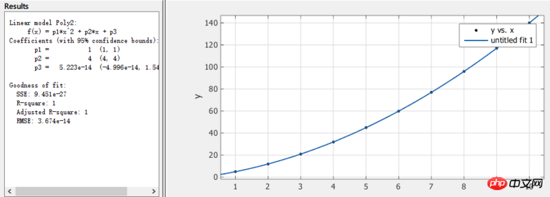 取前10个数,二阶拟合:结果在左边那个框里,95%的置信区间。p3太小了,可以直接省掉。所以结果就是:f(x) = x^2 + 4 * x