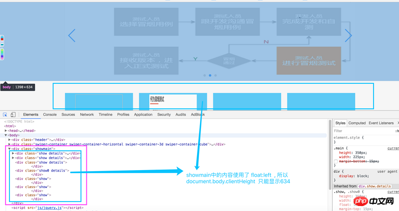 showmain中的内容使用了 float:left , 所以document.body.clientHeight 只能显示那只是BODY的高度634,在html的1419却包含了showmain的高度