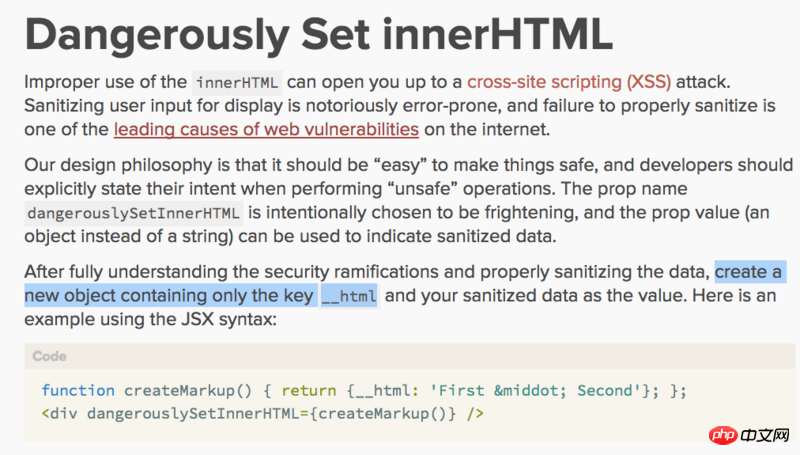 html,不希望react对其中可能被xss攻击的内容进行转义,就用到了dangerouslySetInnerHTML属性:文档地址:Dangerously Set innerHTML